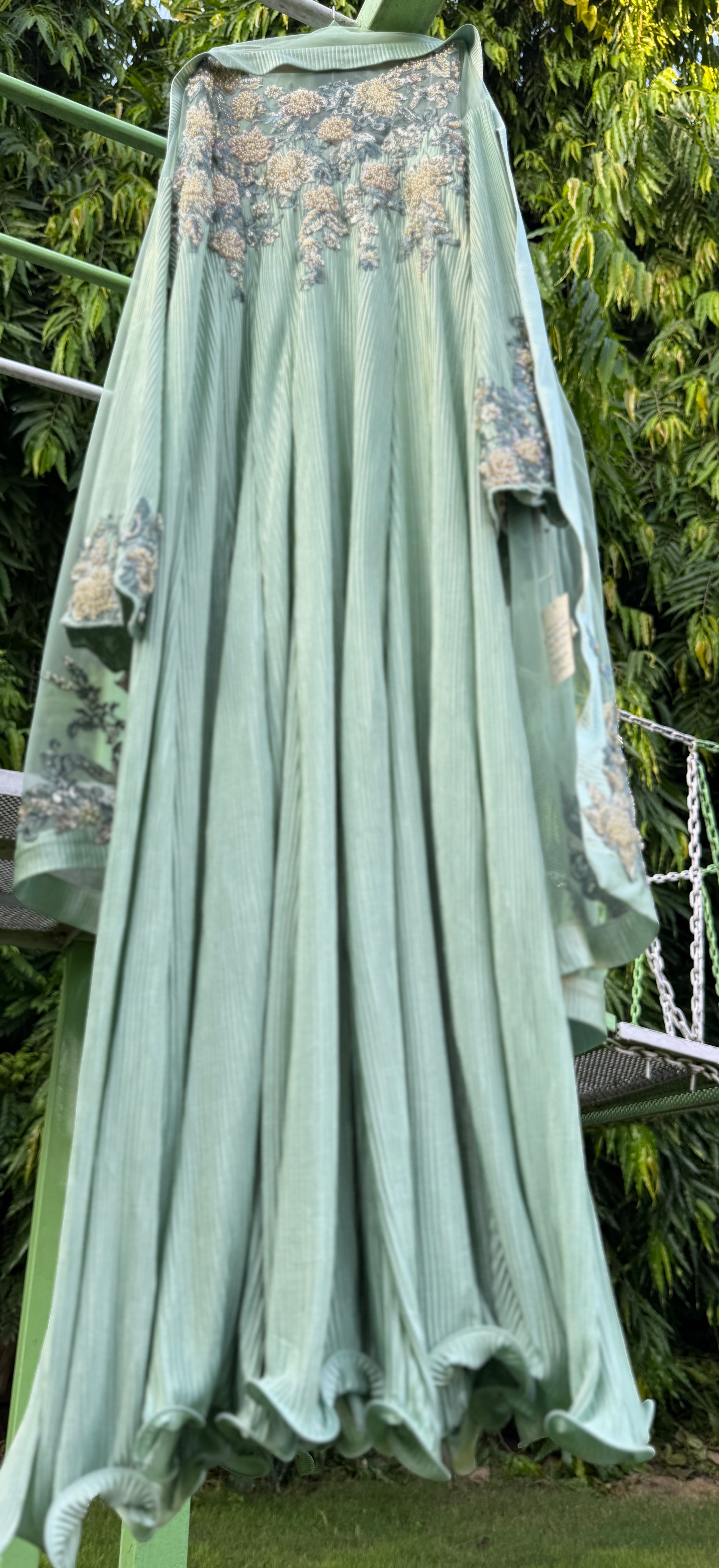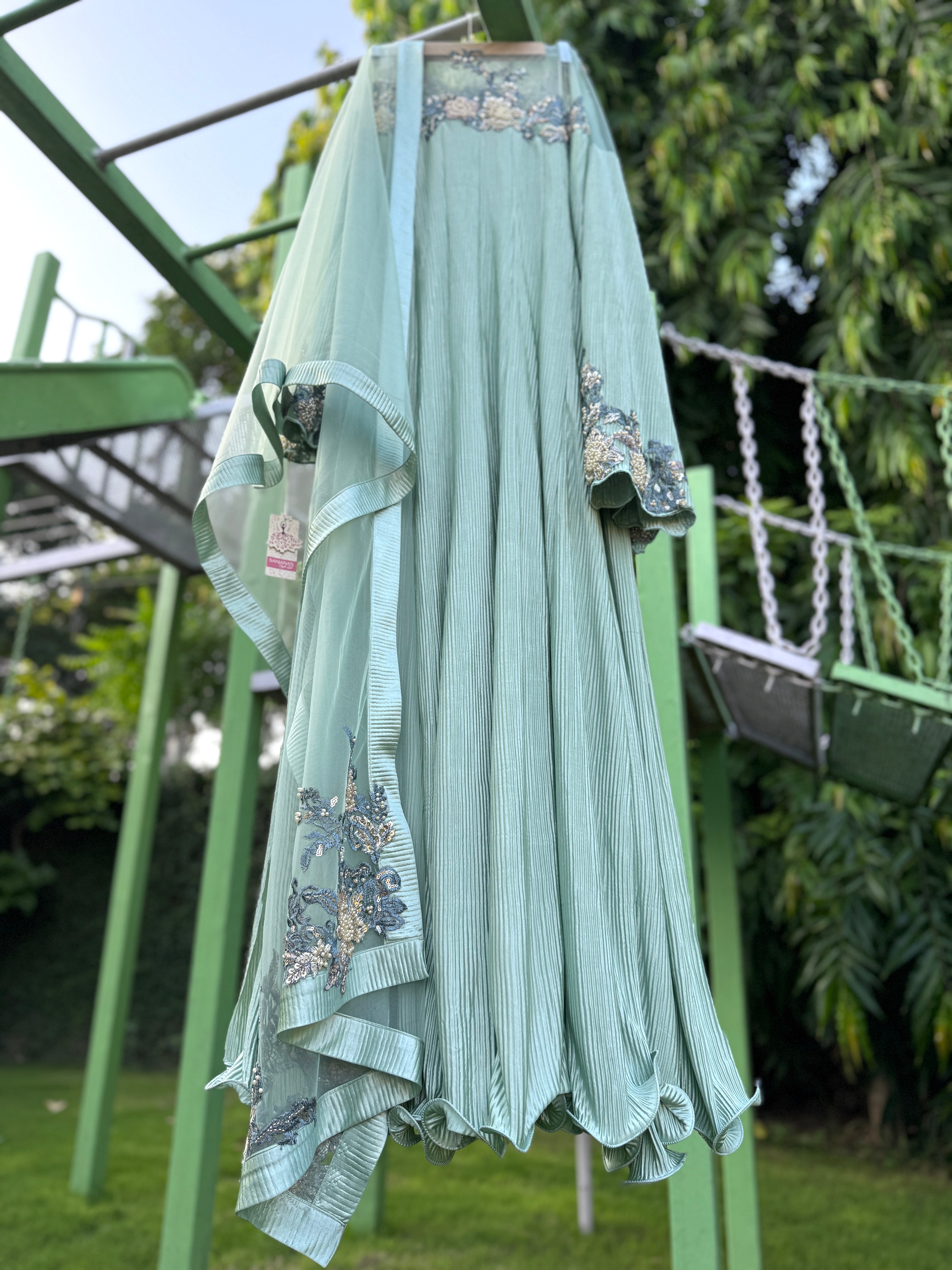 Shirt- front, back yoke have sequin, thread, beads and cutdana work Dupatta- 4 side lycra pleated border and 4 corner Embroidery