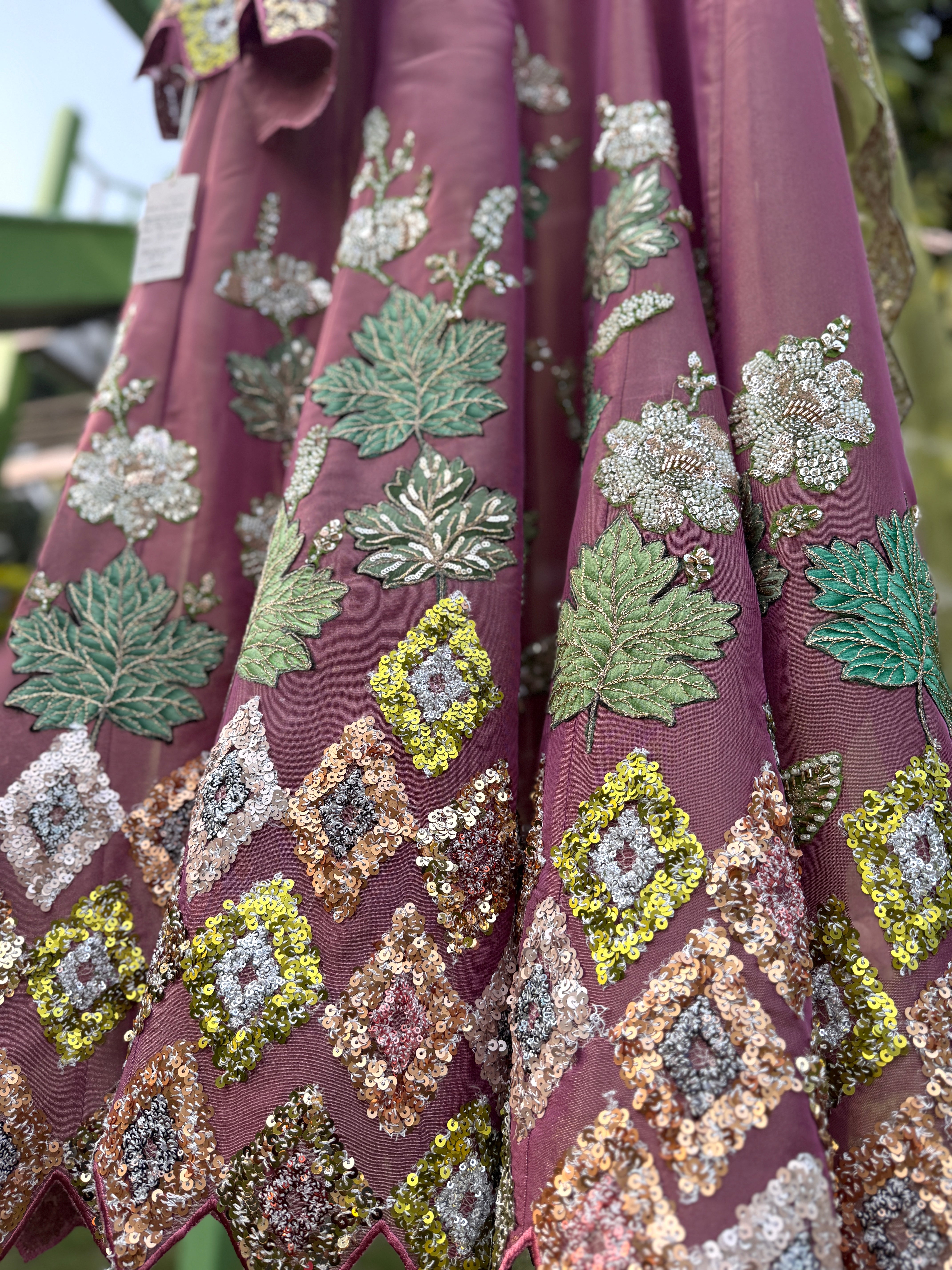 Embroidery- front, back and sleeve -thread work, cutdana, printed patch with dori work, nalki work and bead work.