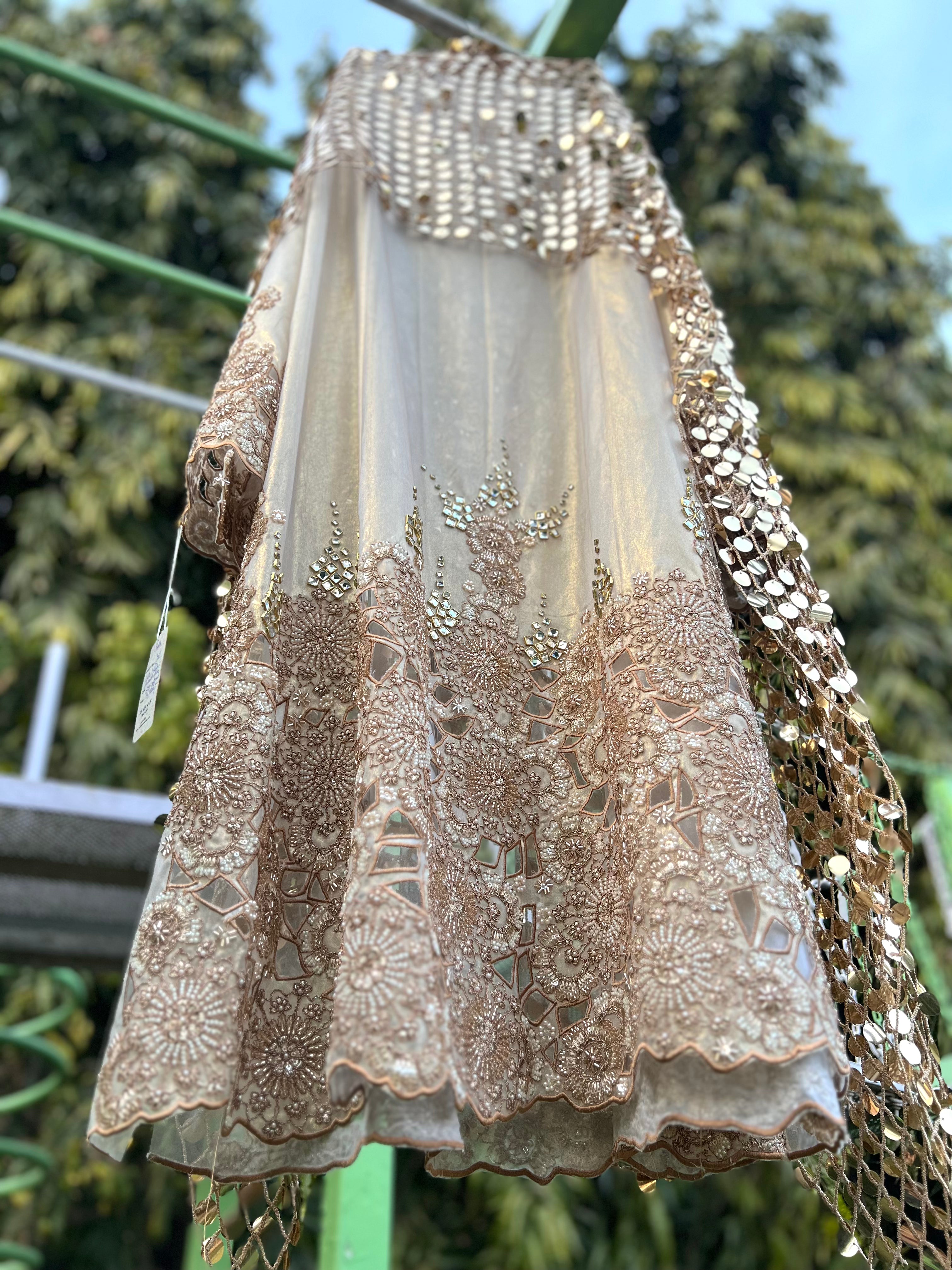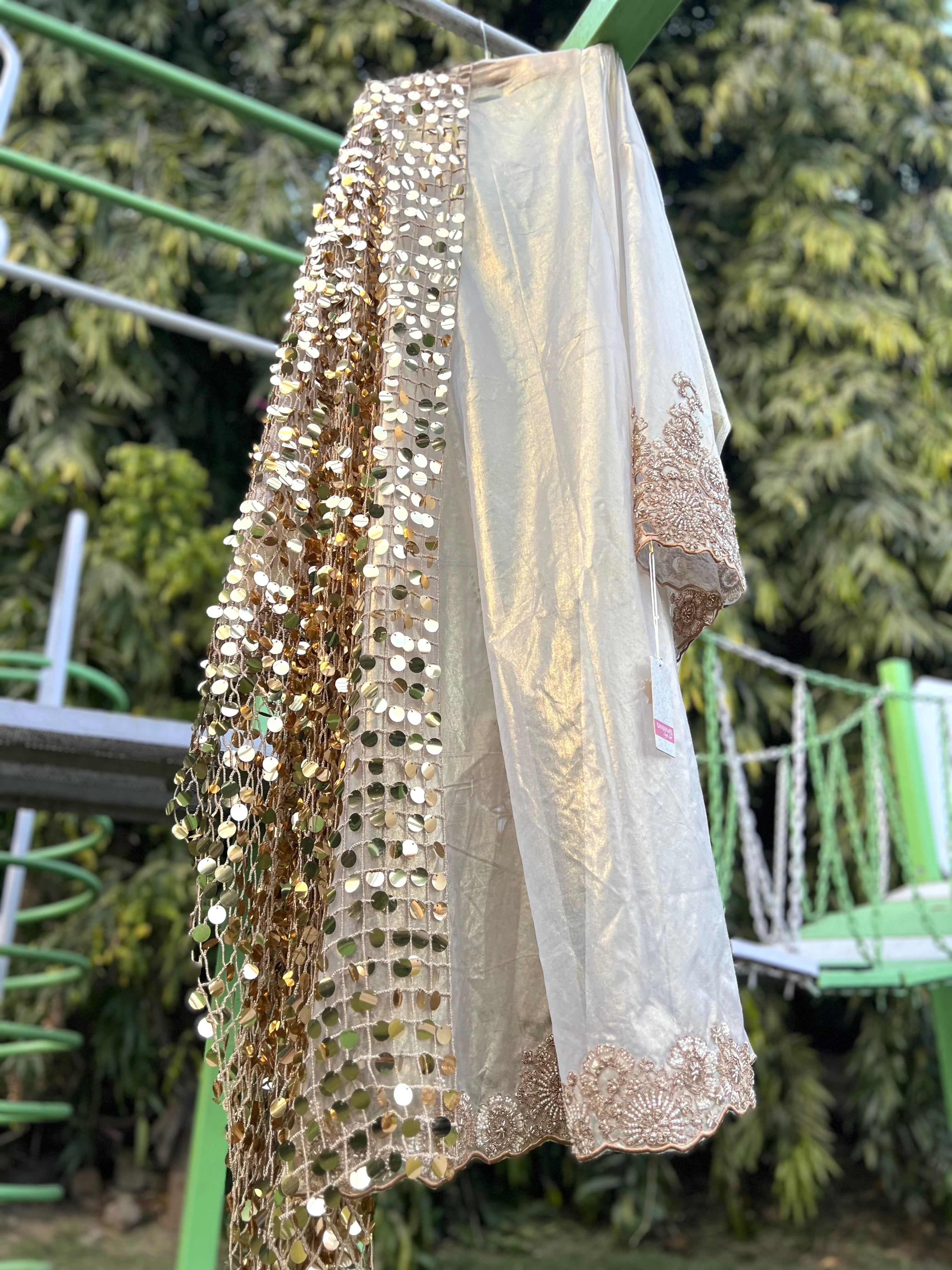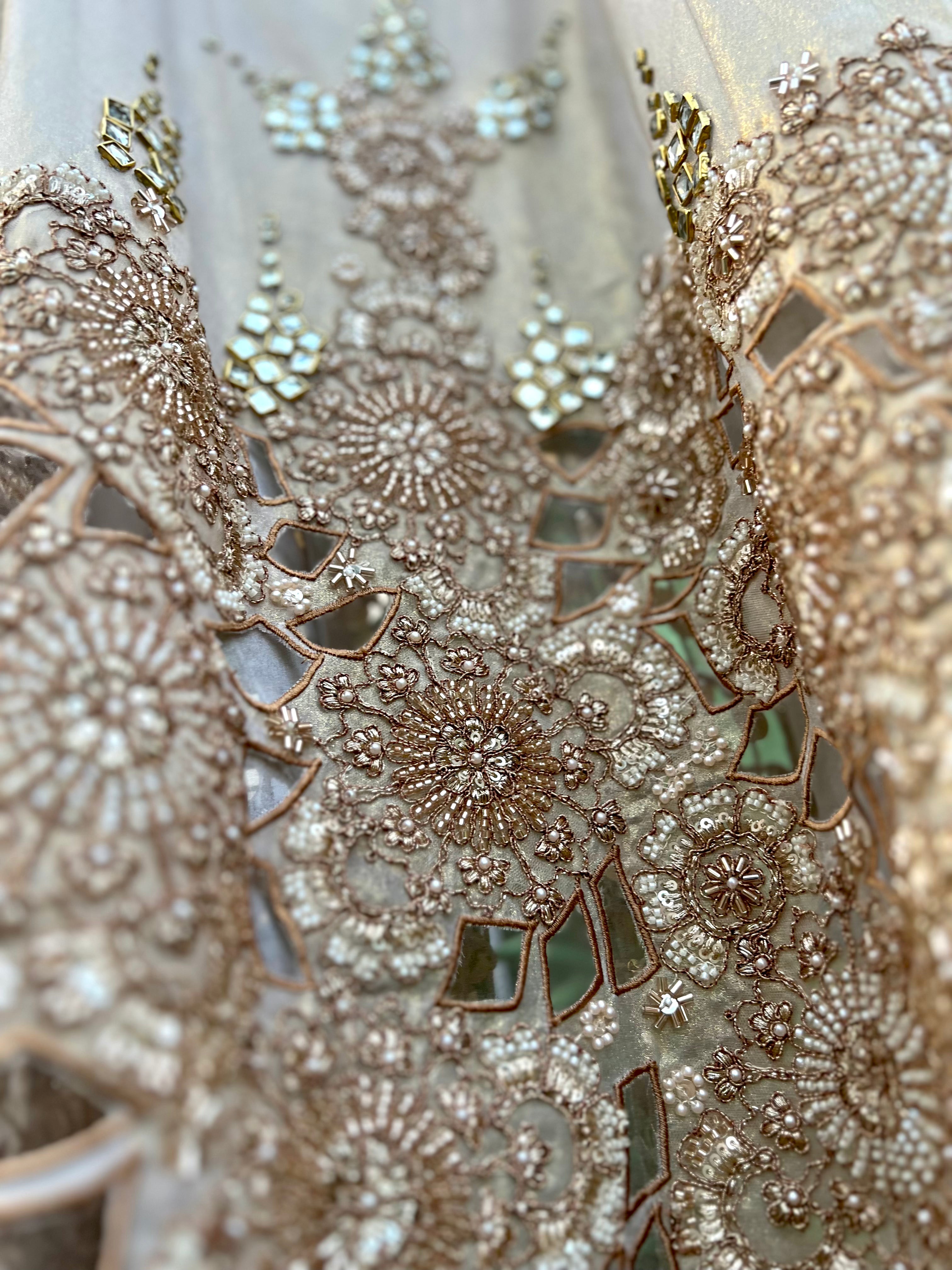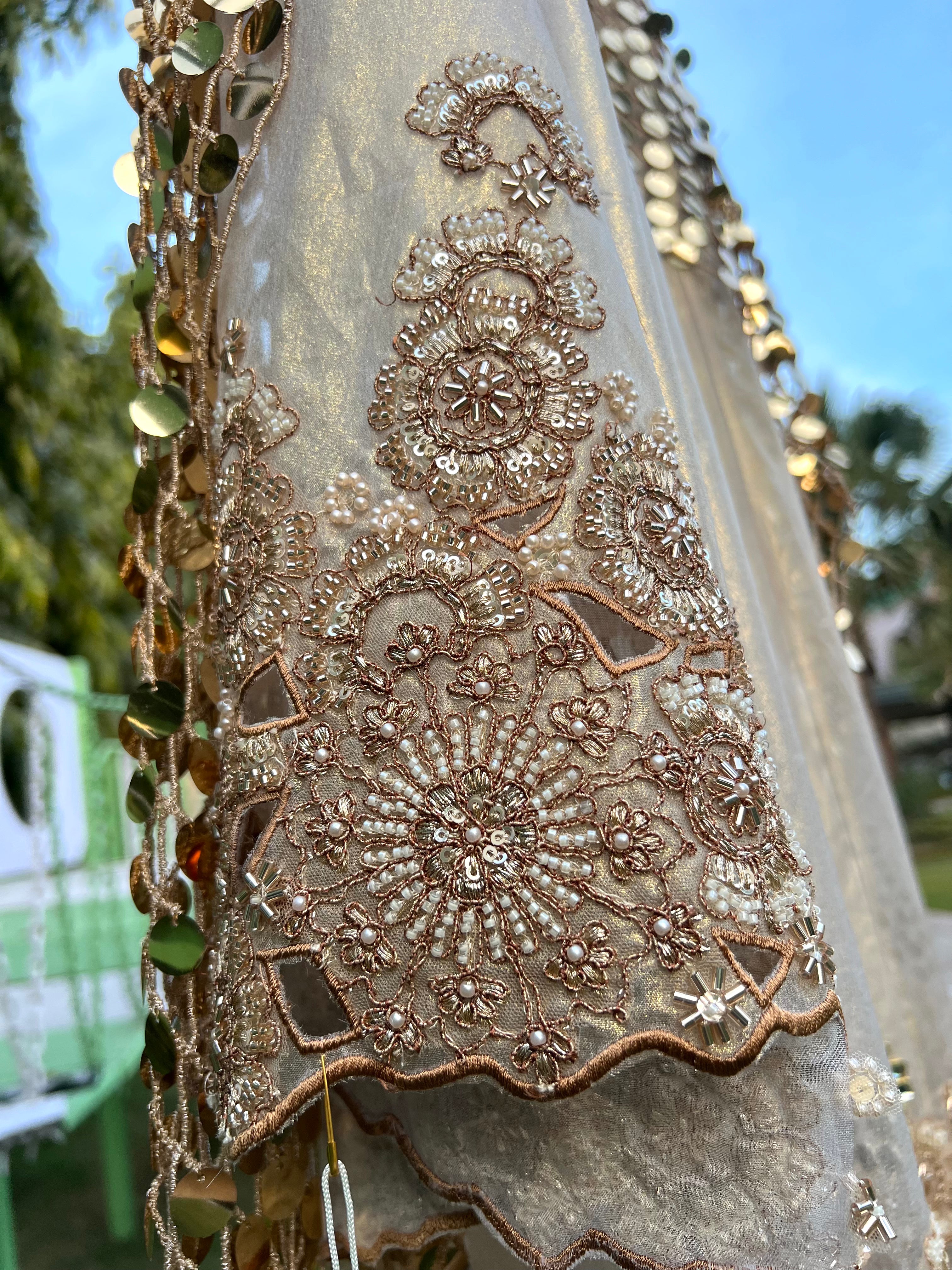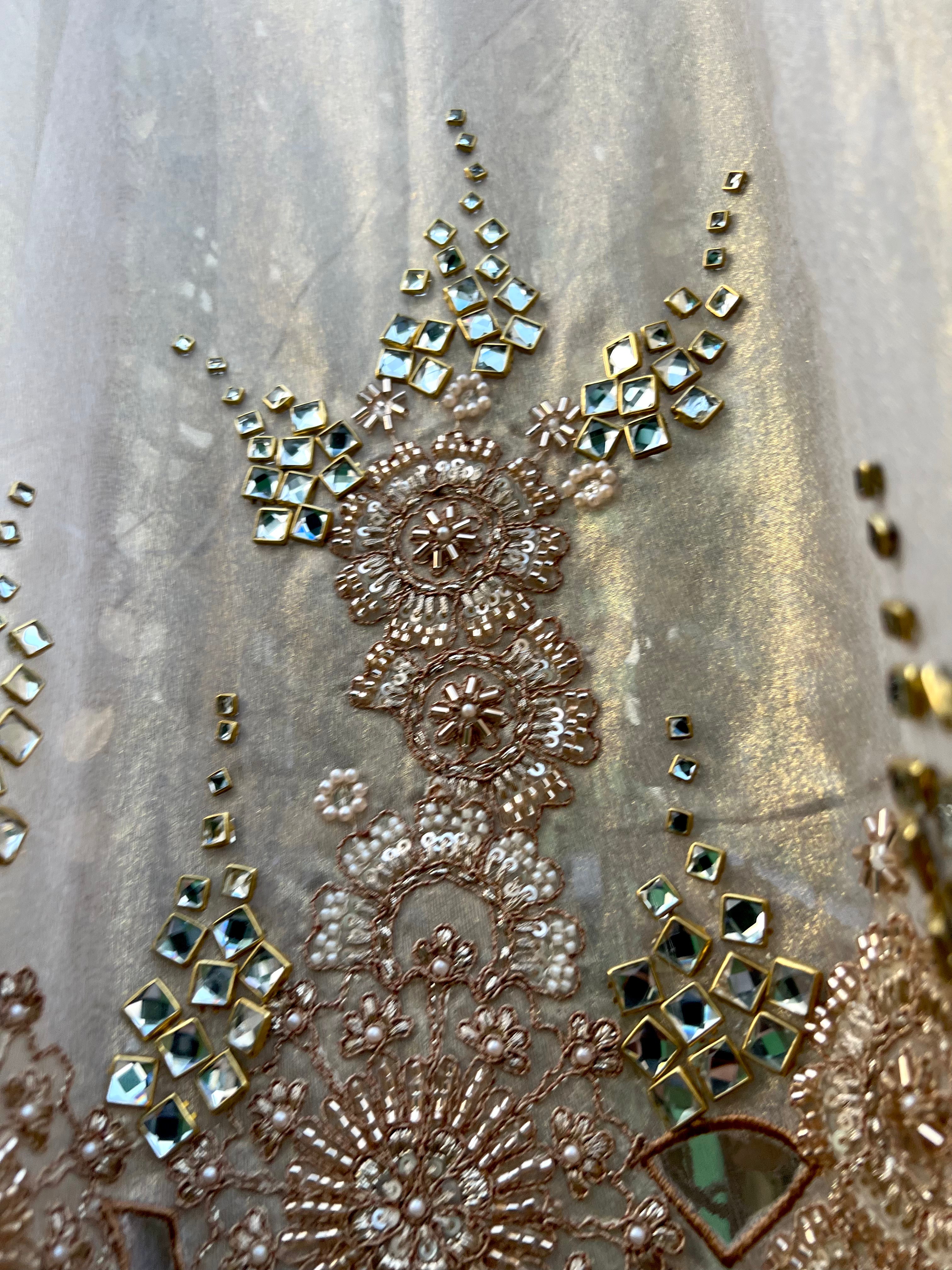 Shirt- front, back and sleeve thread, tilla, kundan, hand cutwork, beads, cutdana and sequin work. Dupatta- mesh sequin