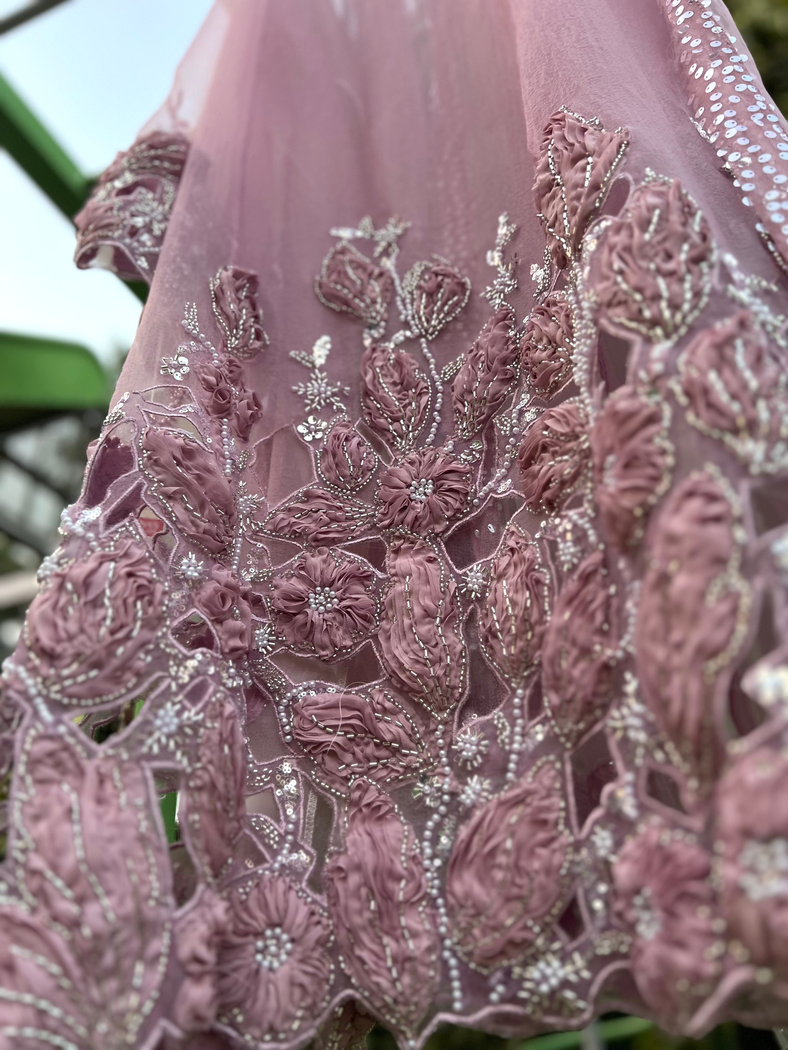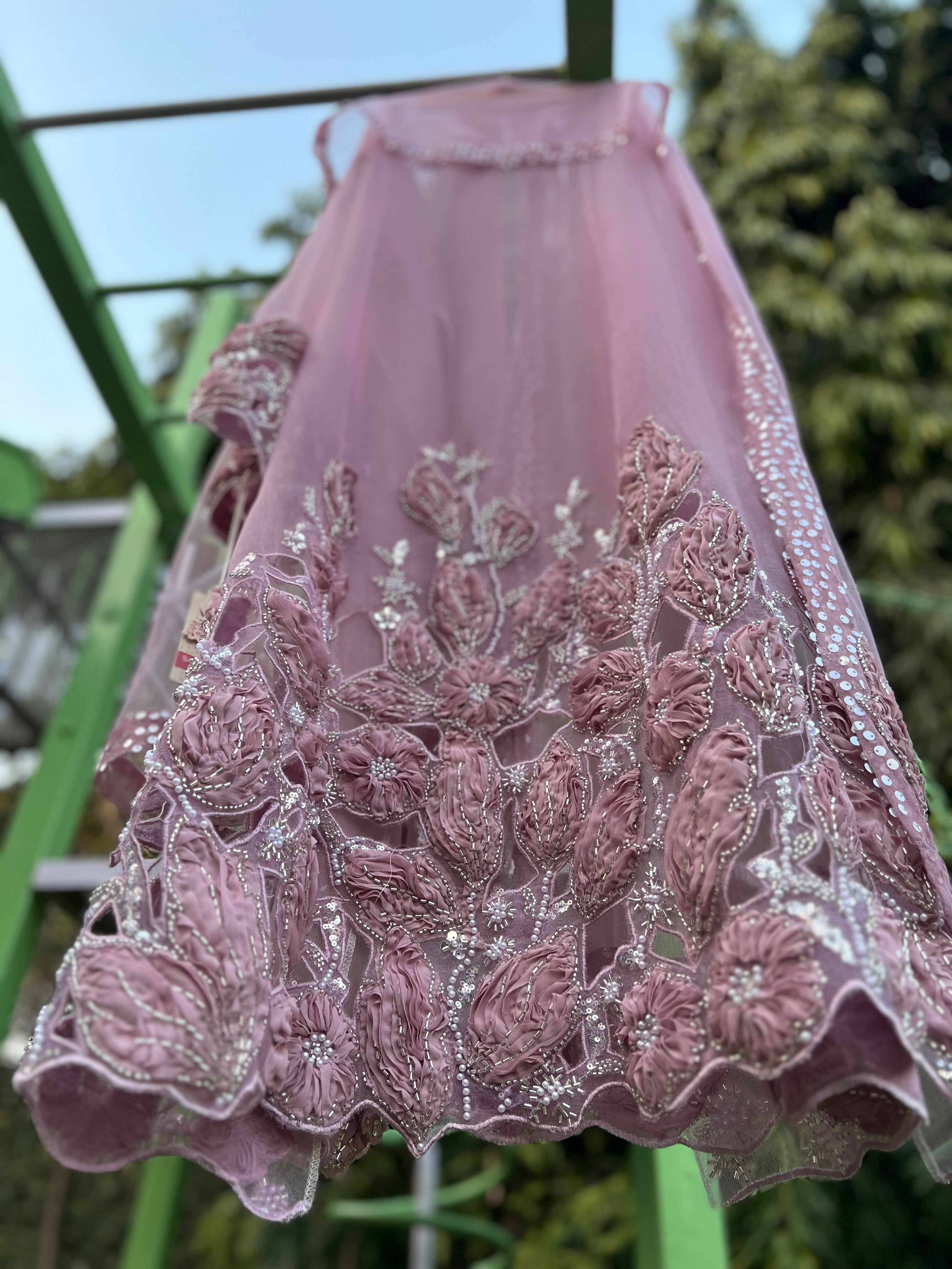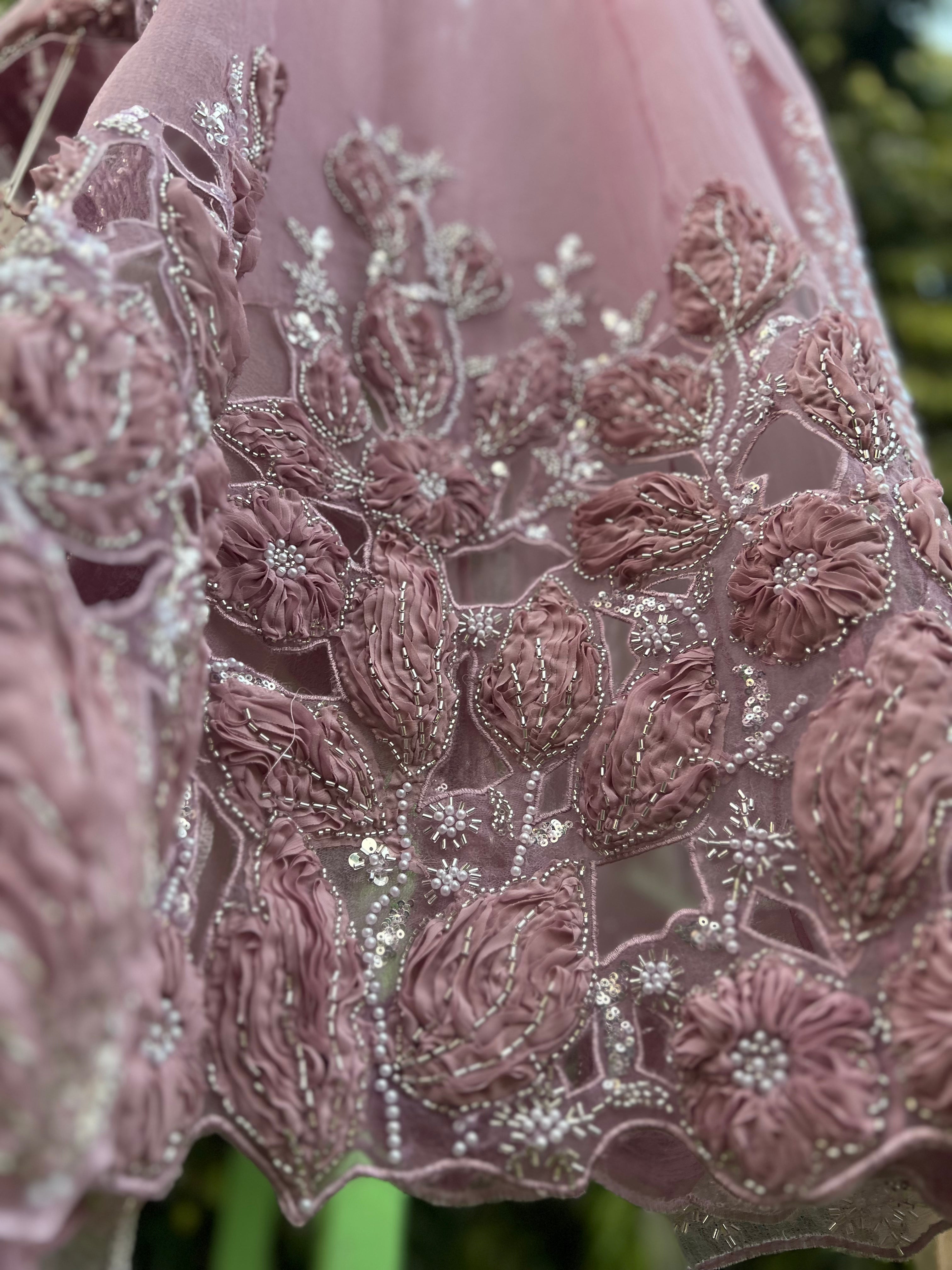 Shirt- front, back and sleeve fabric Ribbon flower work, beads, hand cutwork and sequin work. Dupatta- 4 side sequin border and 4 corner embroidery.