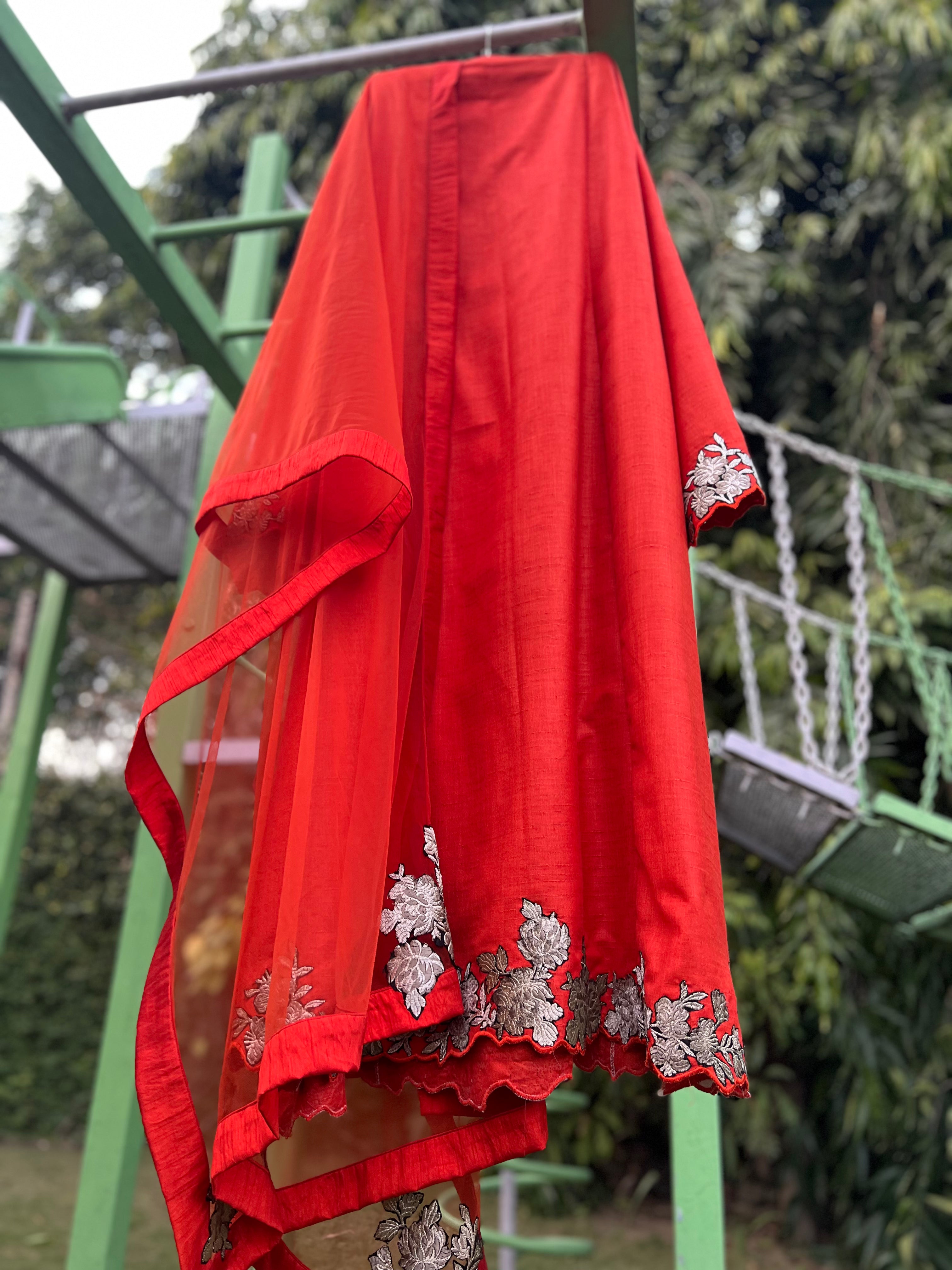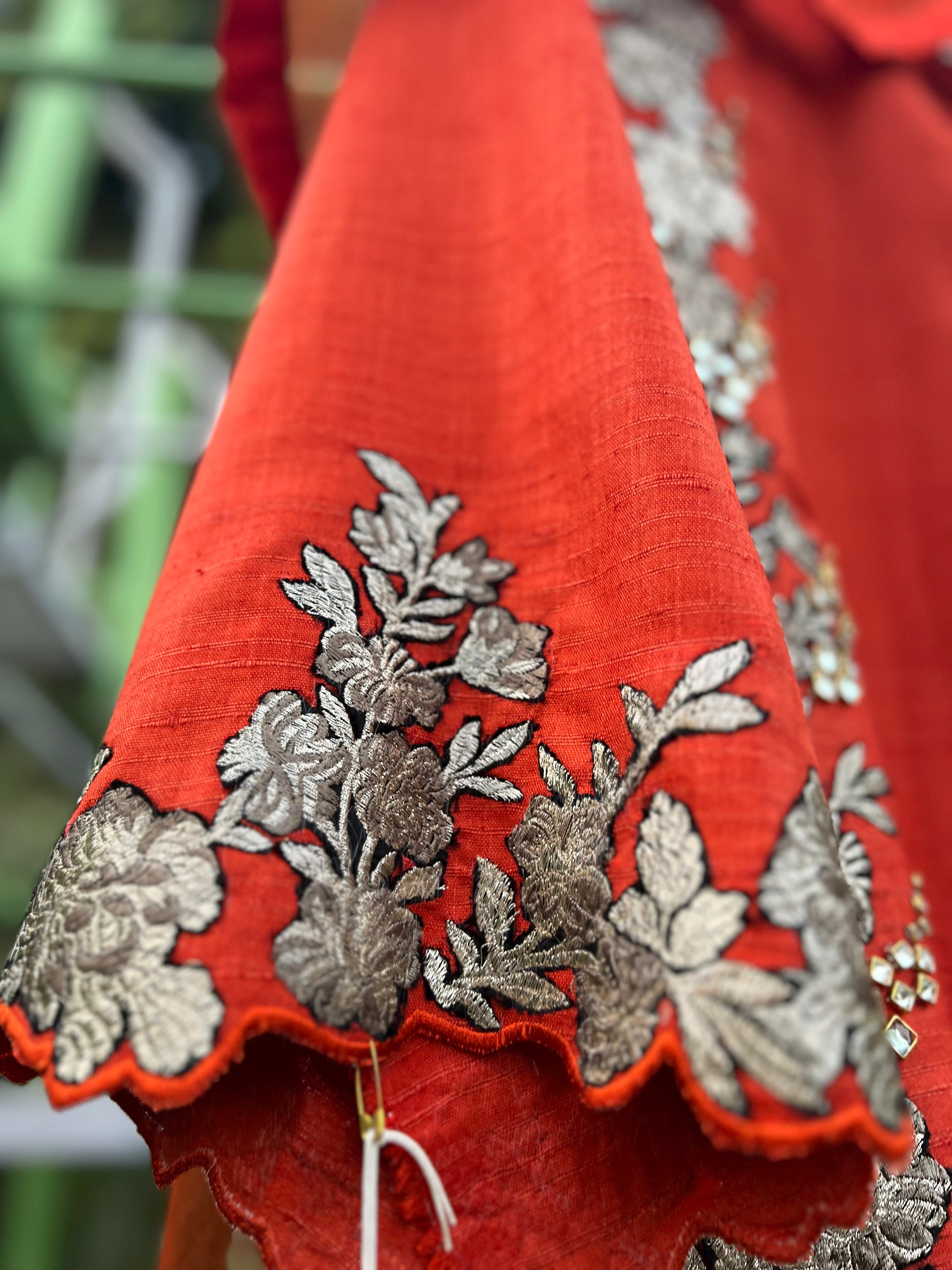 Shirt- front, back and sleeves have kundan and brocade patch embroidery. Dupatta- 4 side khadi silk border and 4 corner embroidery.
