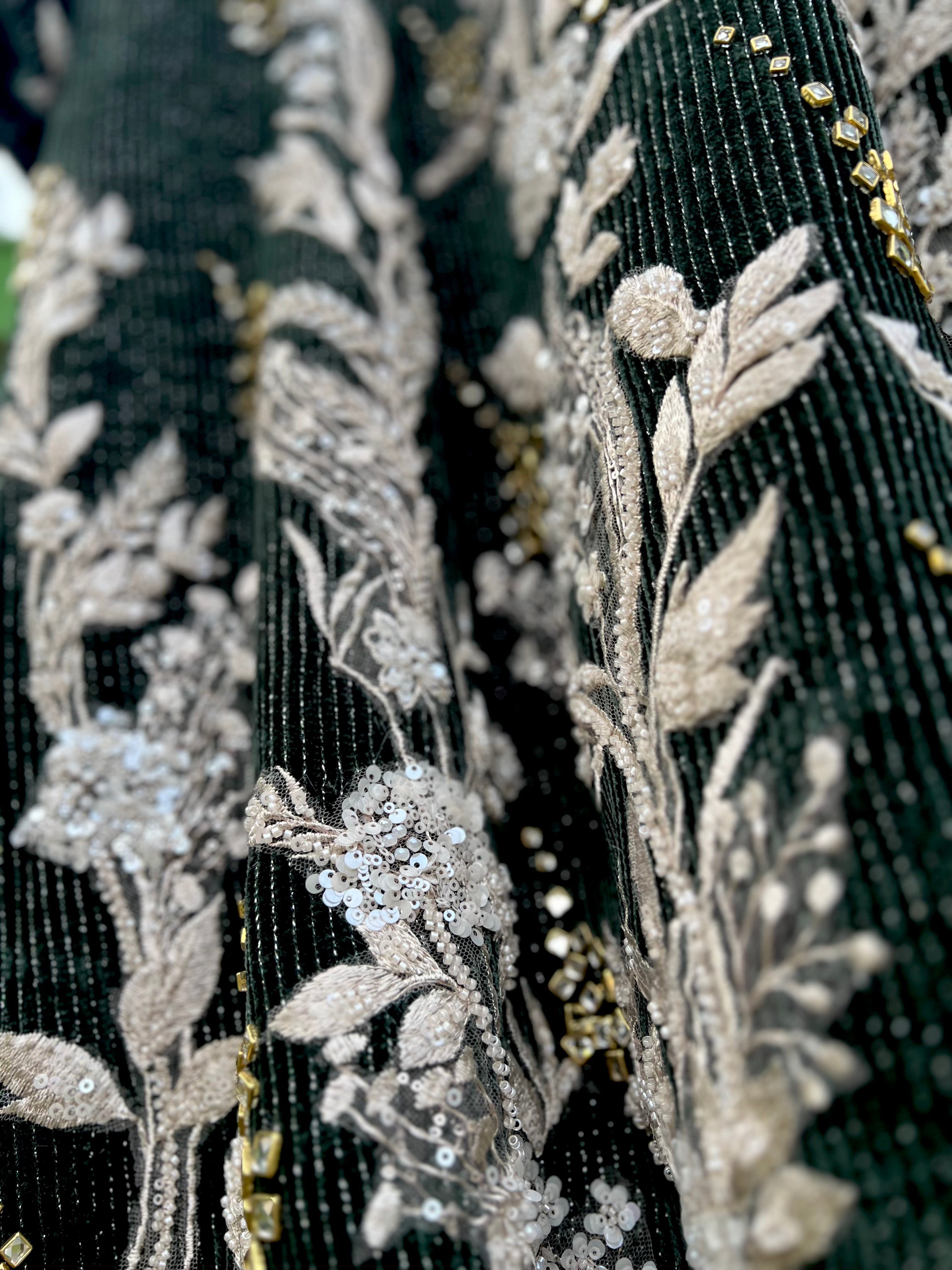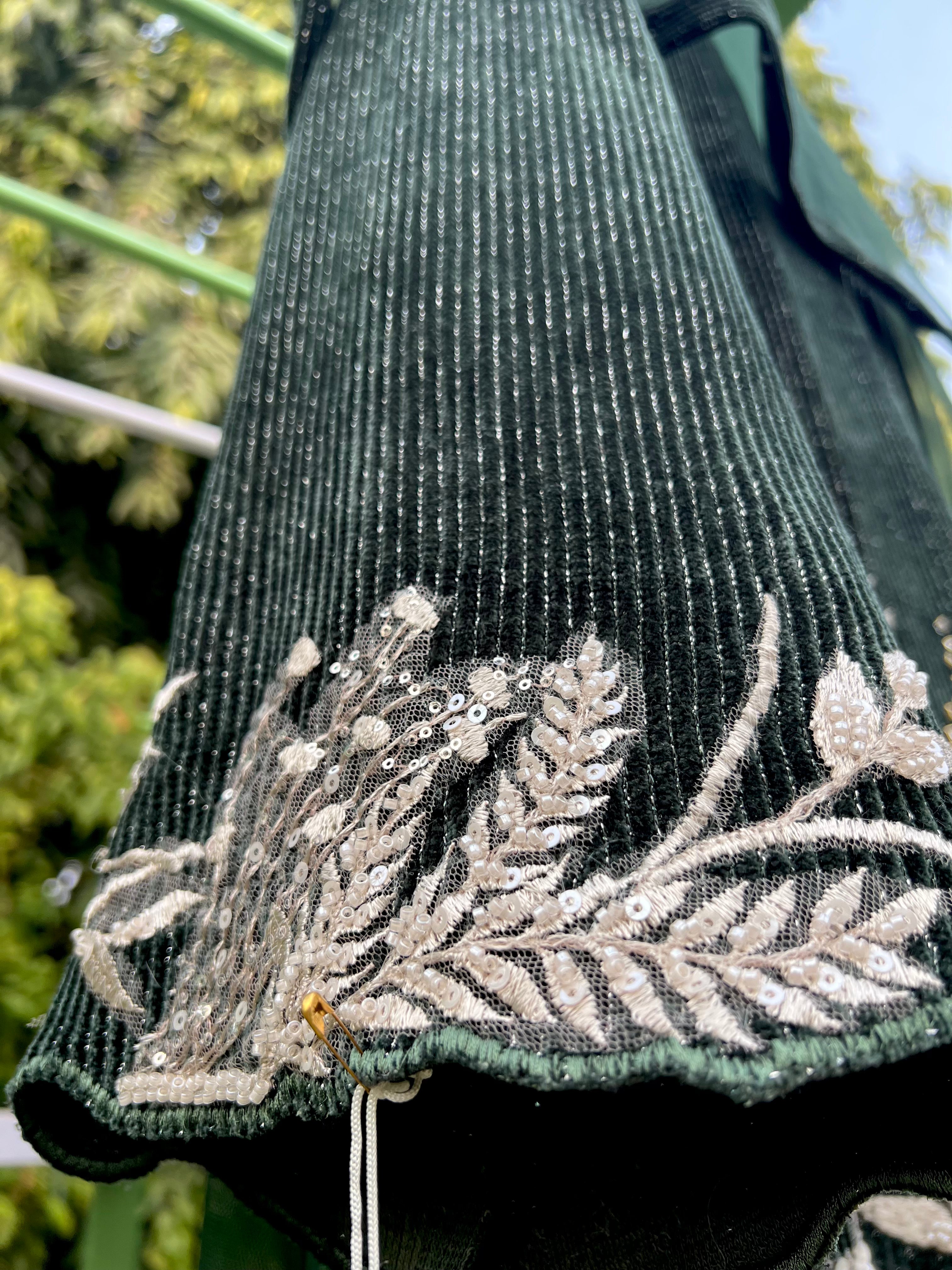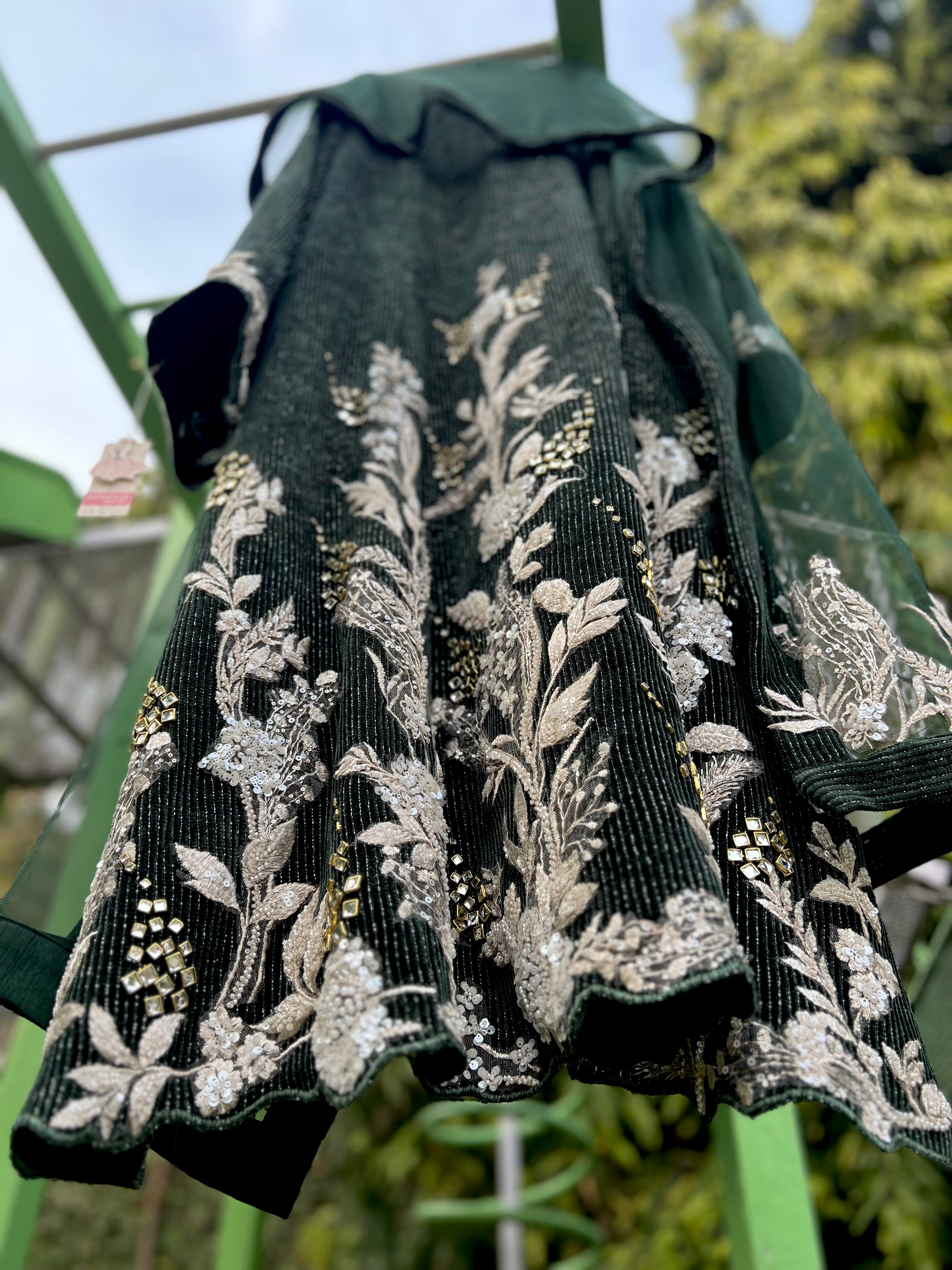 Shirt- front, back and sleeve have thread, beads, sequin and kundan embroidery. Dupatta- 4 side cord velvet border and 4 corner embroidery
