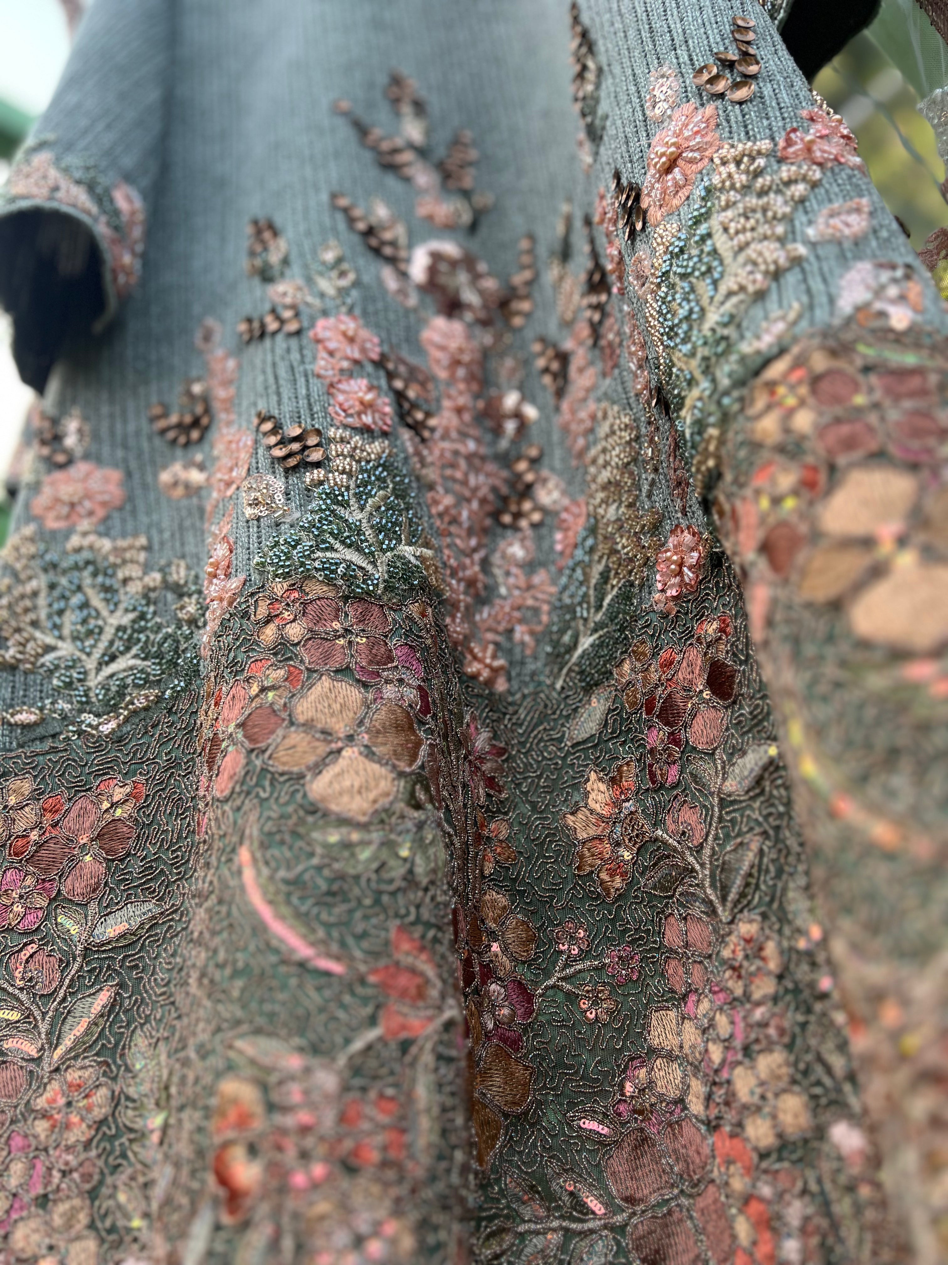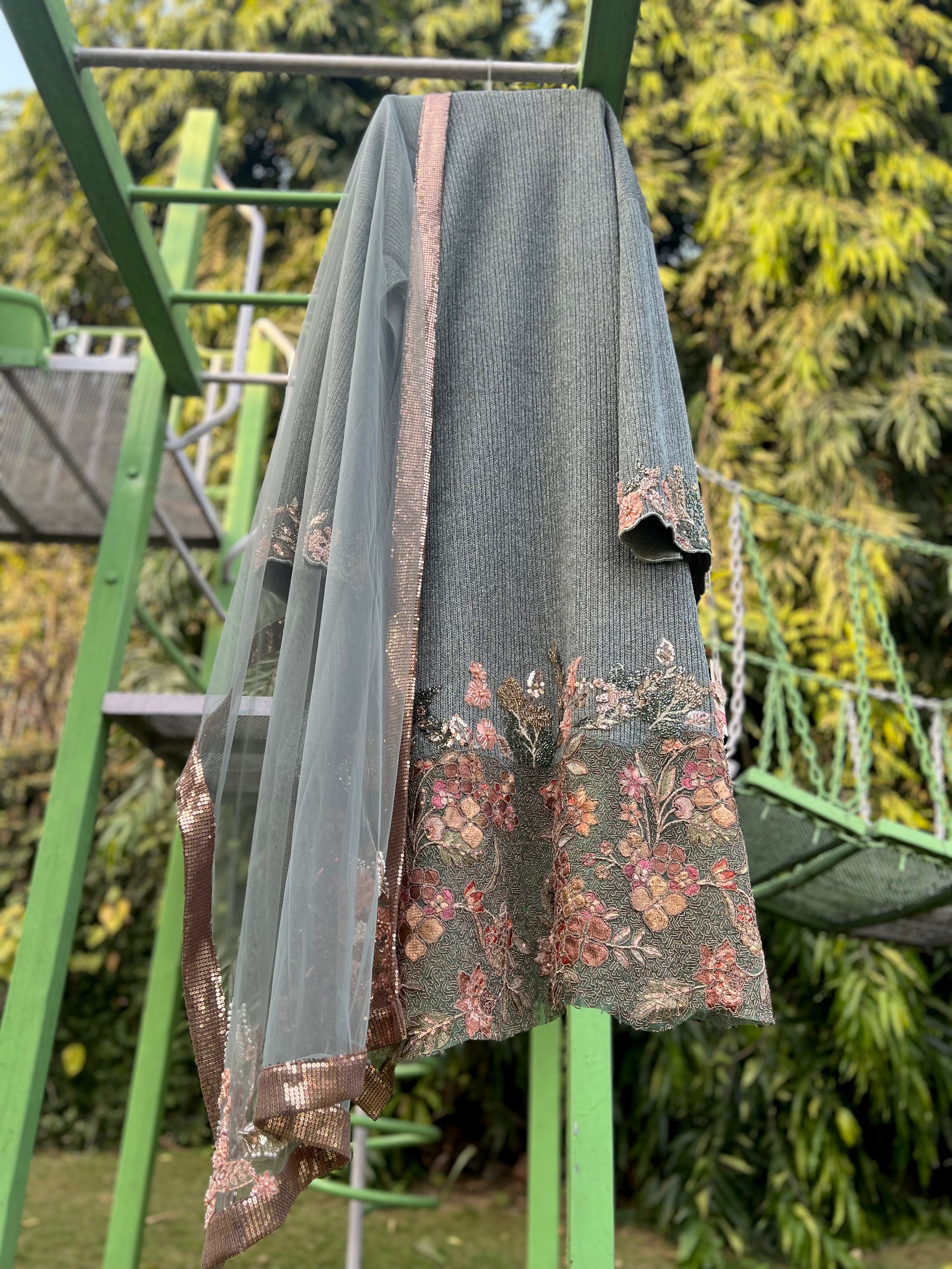 Shirt- front, back and sleeve have sequin, Beads, thread, cutdana and dori embroidery. Dupatta- 4 side sequin border and 4 corner embroidery