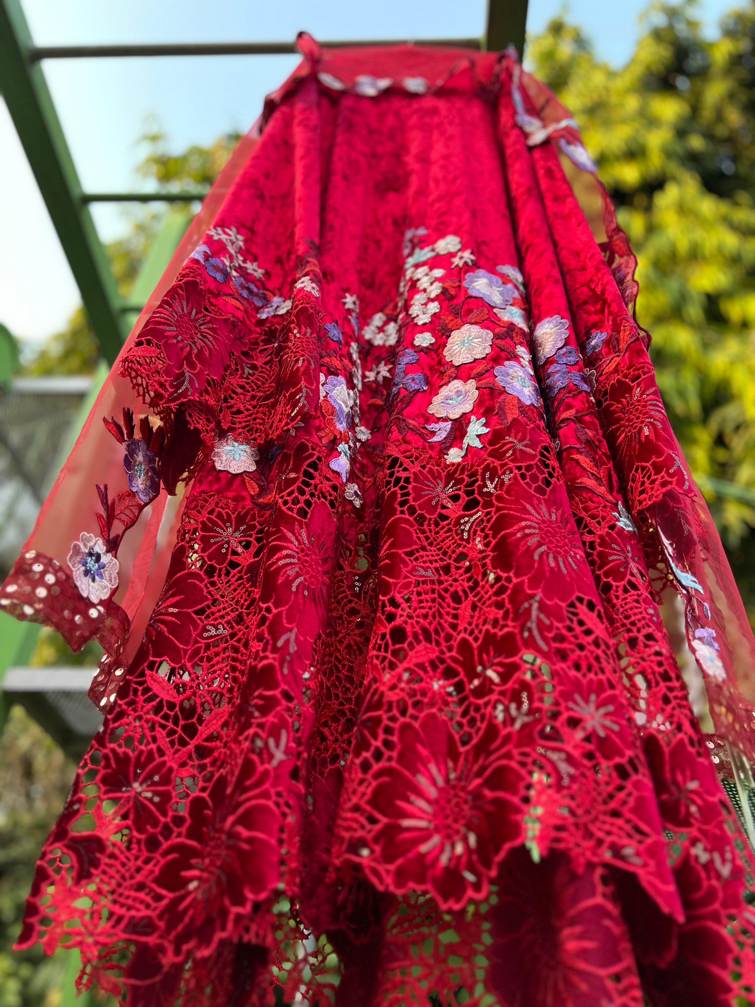 Shirt-Ice velvet and Cutwork Velvet embroidery at hem. Dupatta net