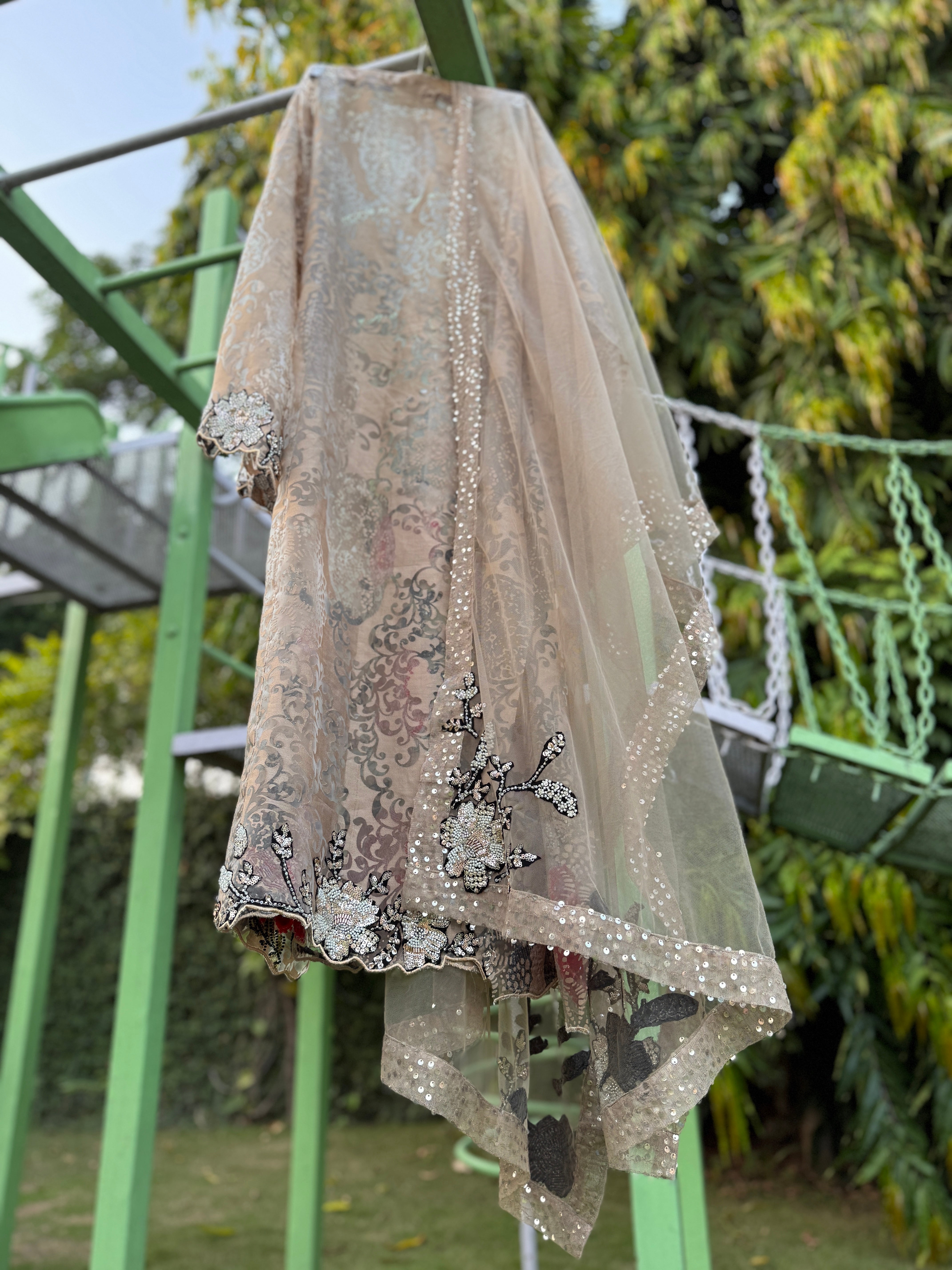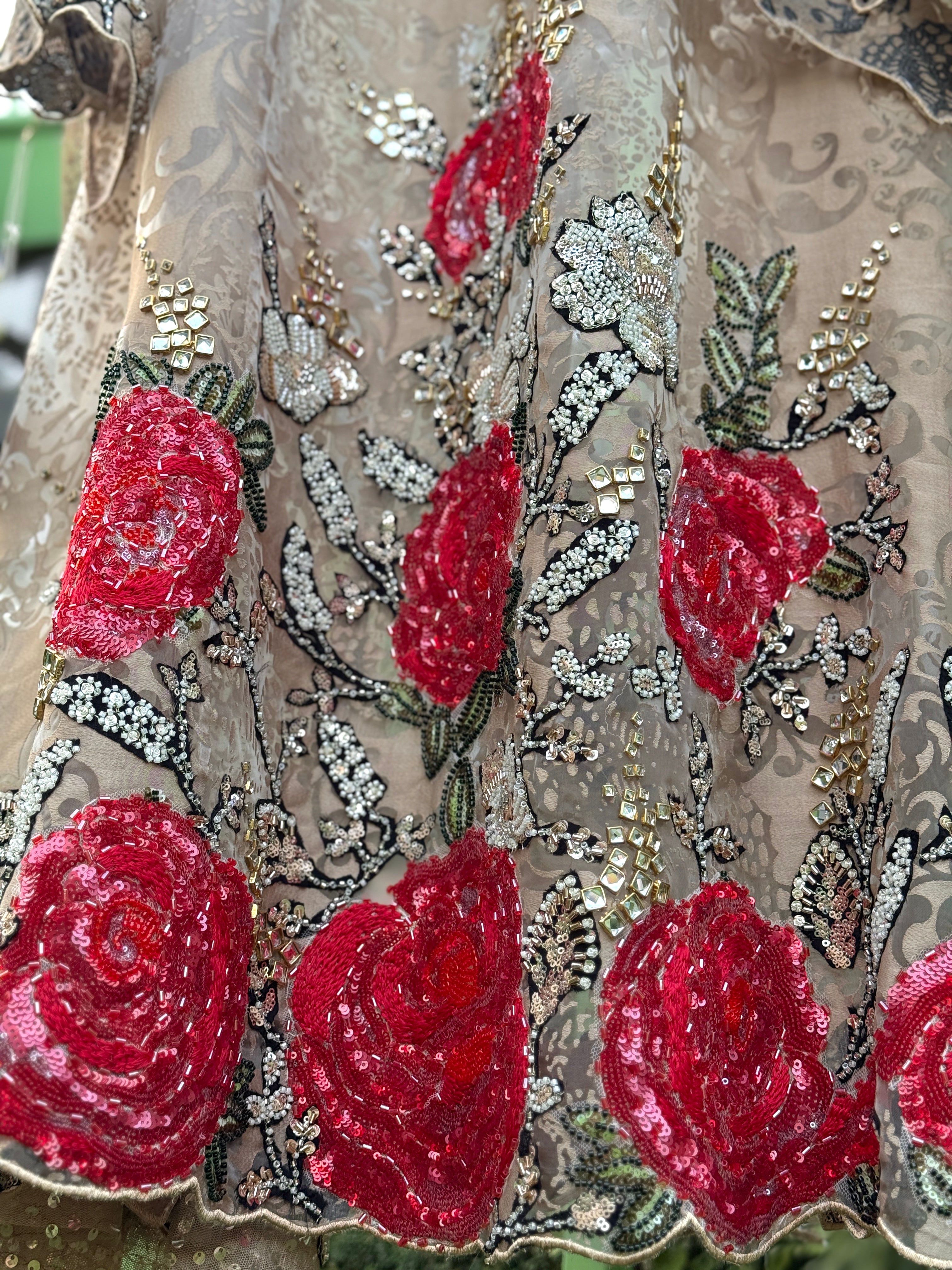 Shirt- front, back and sleeves have sequin, kundan, cutdana and bead embroidery. Dupatta- 4 side sequin border and 4 corner embroidery.