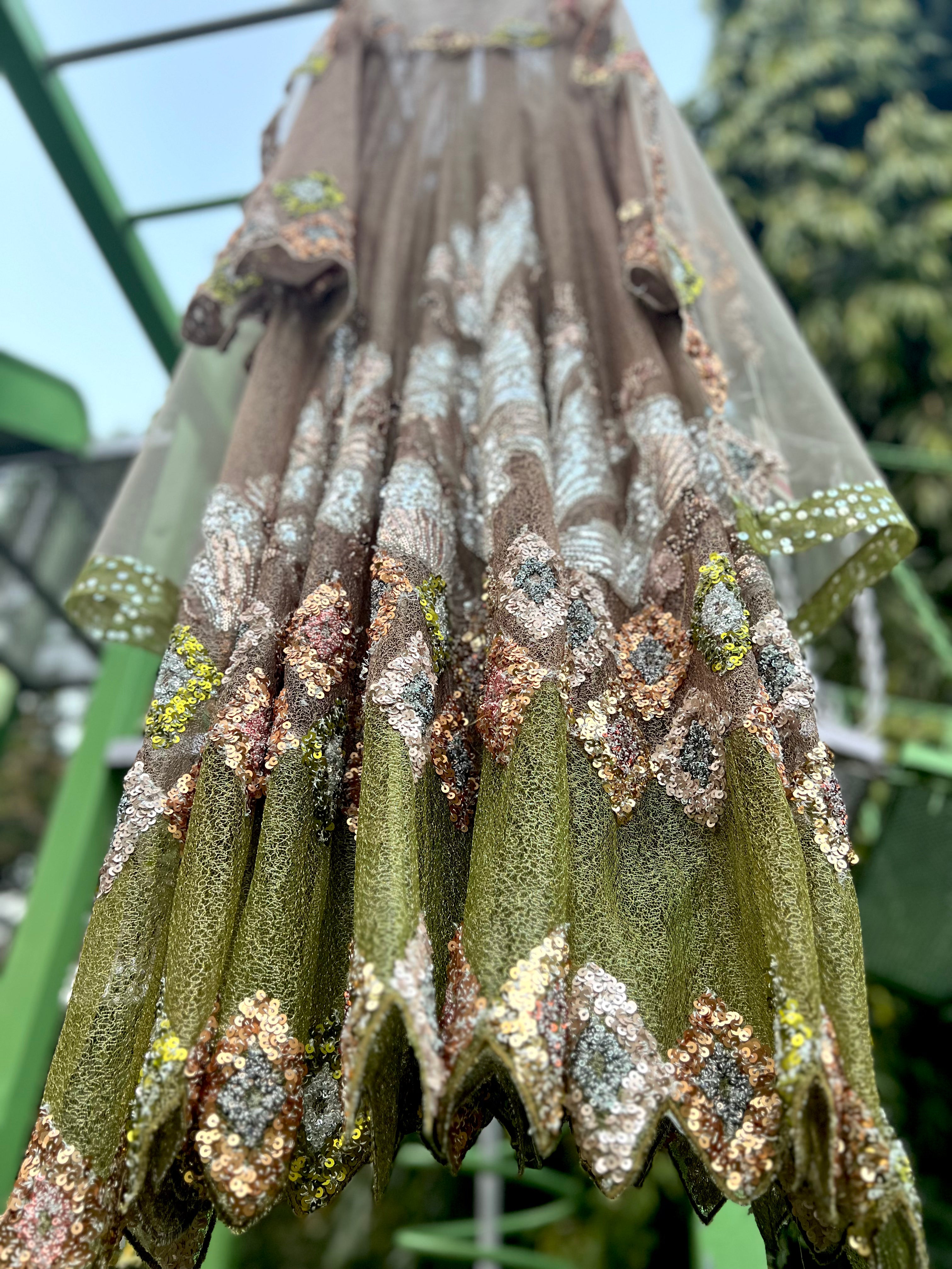 Gold Green Mesh Splash Cutdana Diamond Anarkali