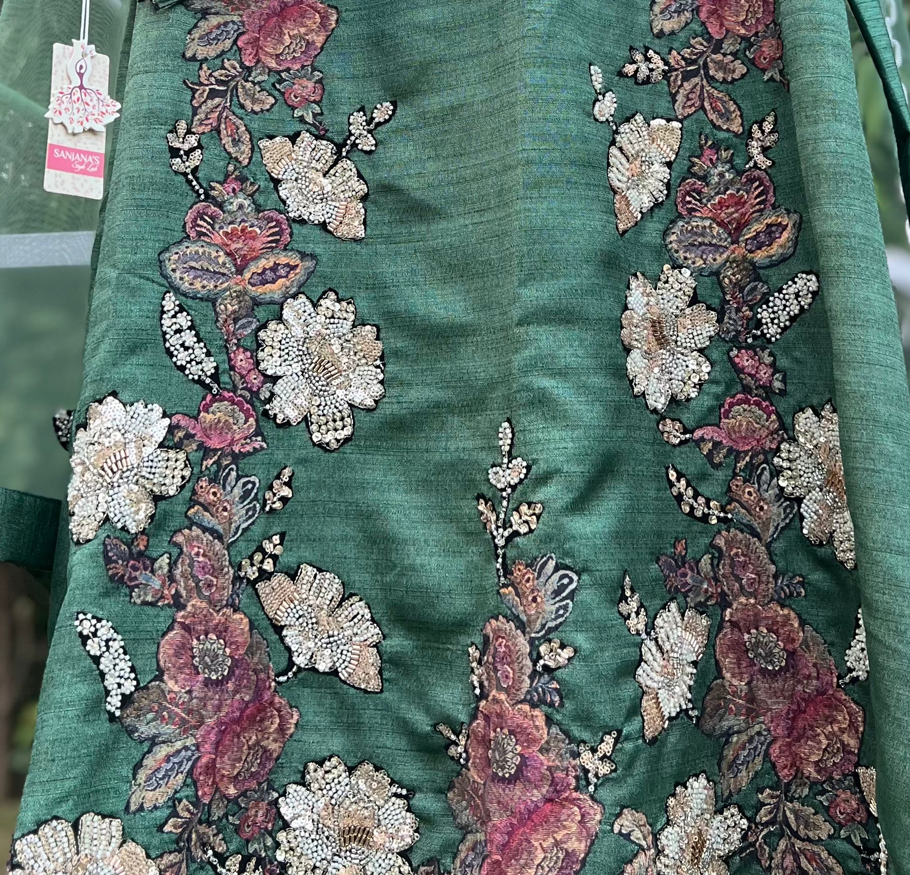 Shirt- front, back and sleeves have sequin, printed Patch, kundan, cutdana and bead embroidery. Dupatta- 4 side khadi silk border and 4 corner embroidery.