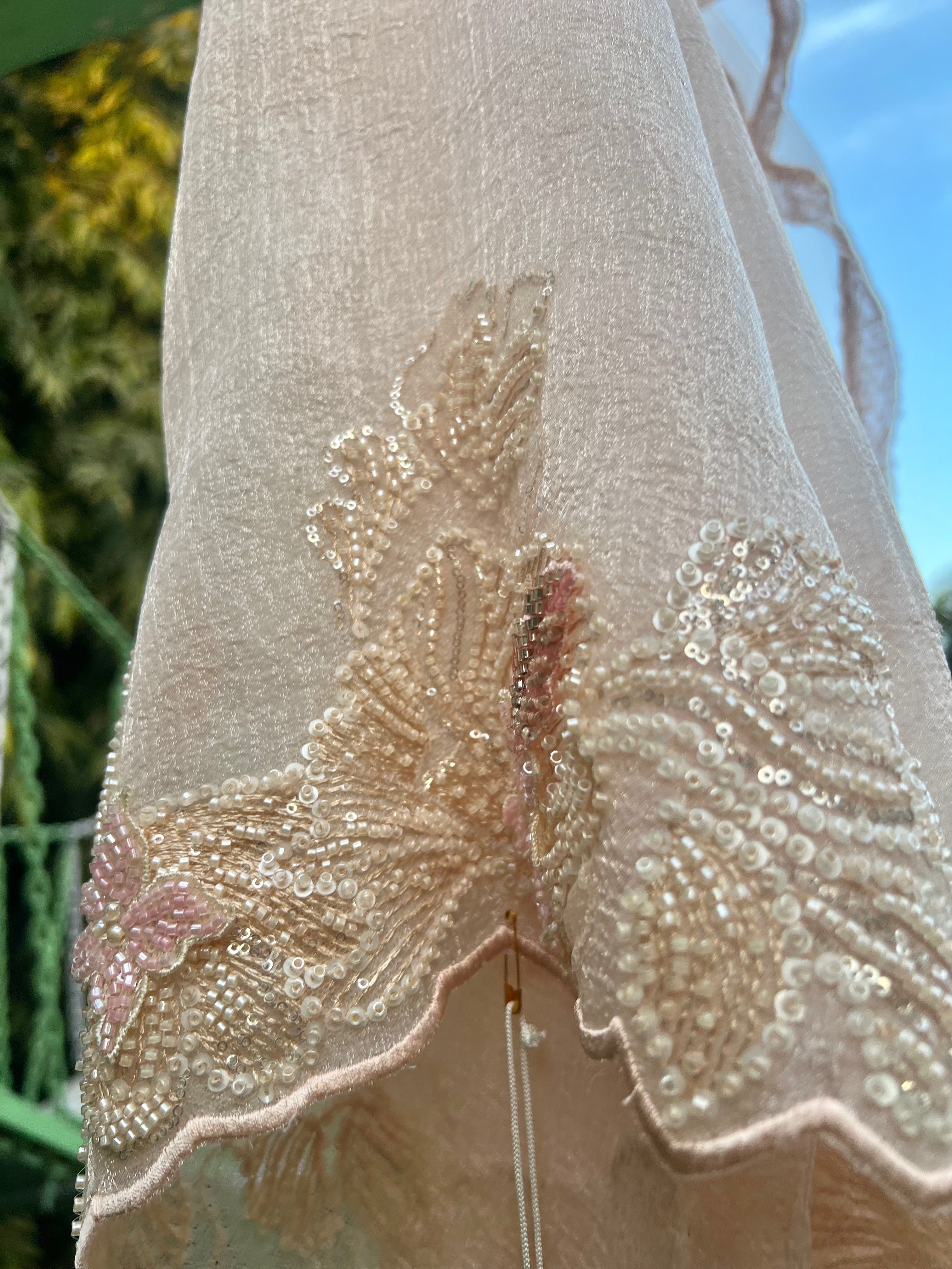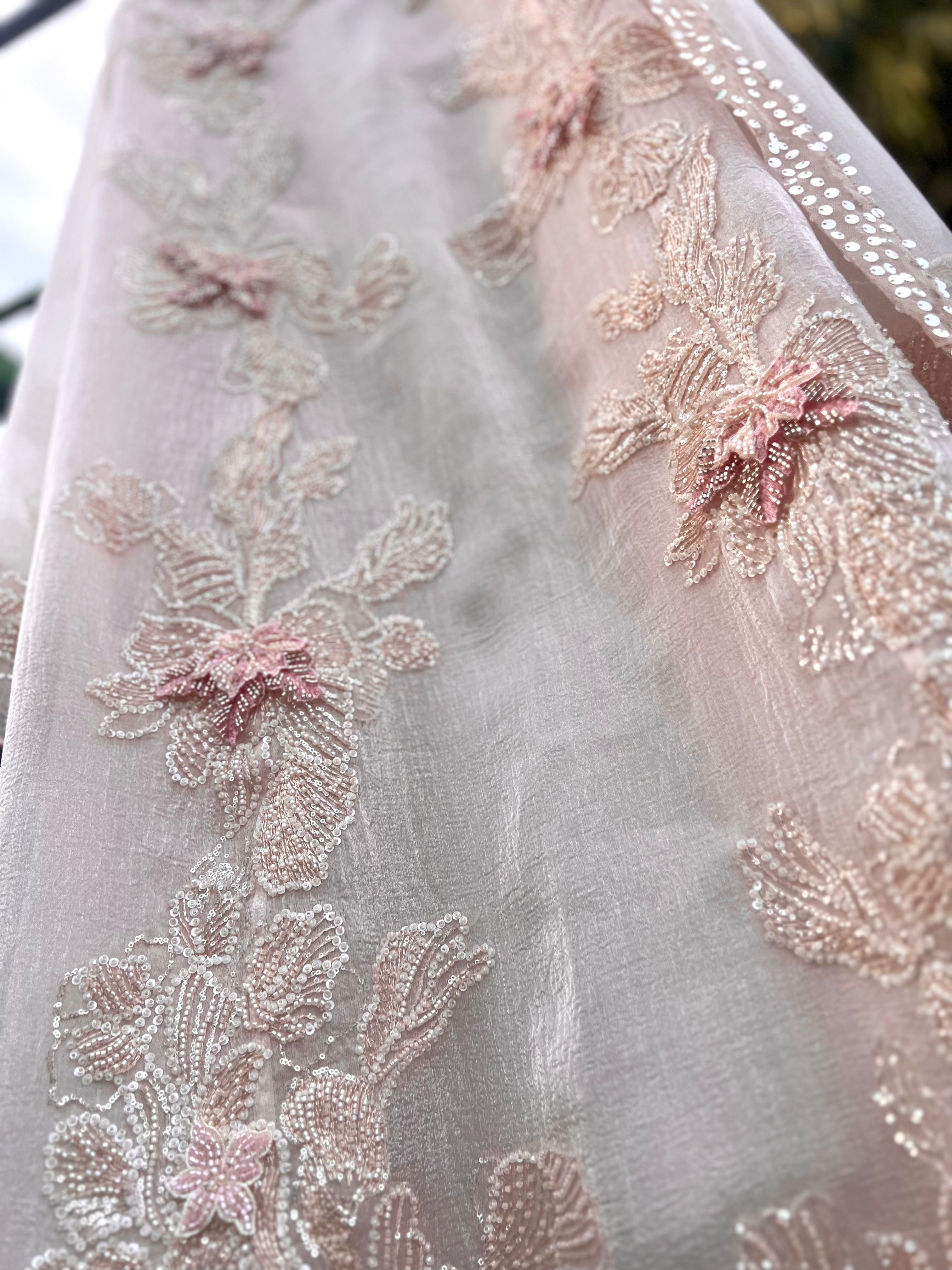 Shirt- front, back and sleeve thread work, beads, 3D flower work, cutdana, sequin work. Dupatta- 4 side sequin border and 4 corner embroidery.