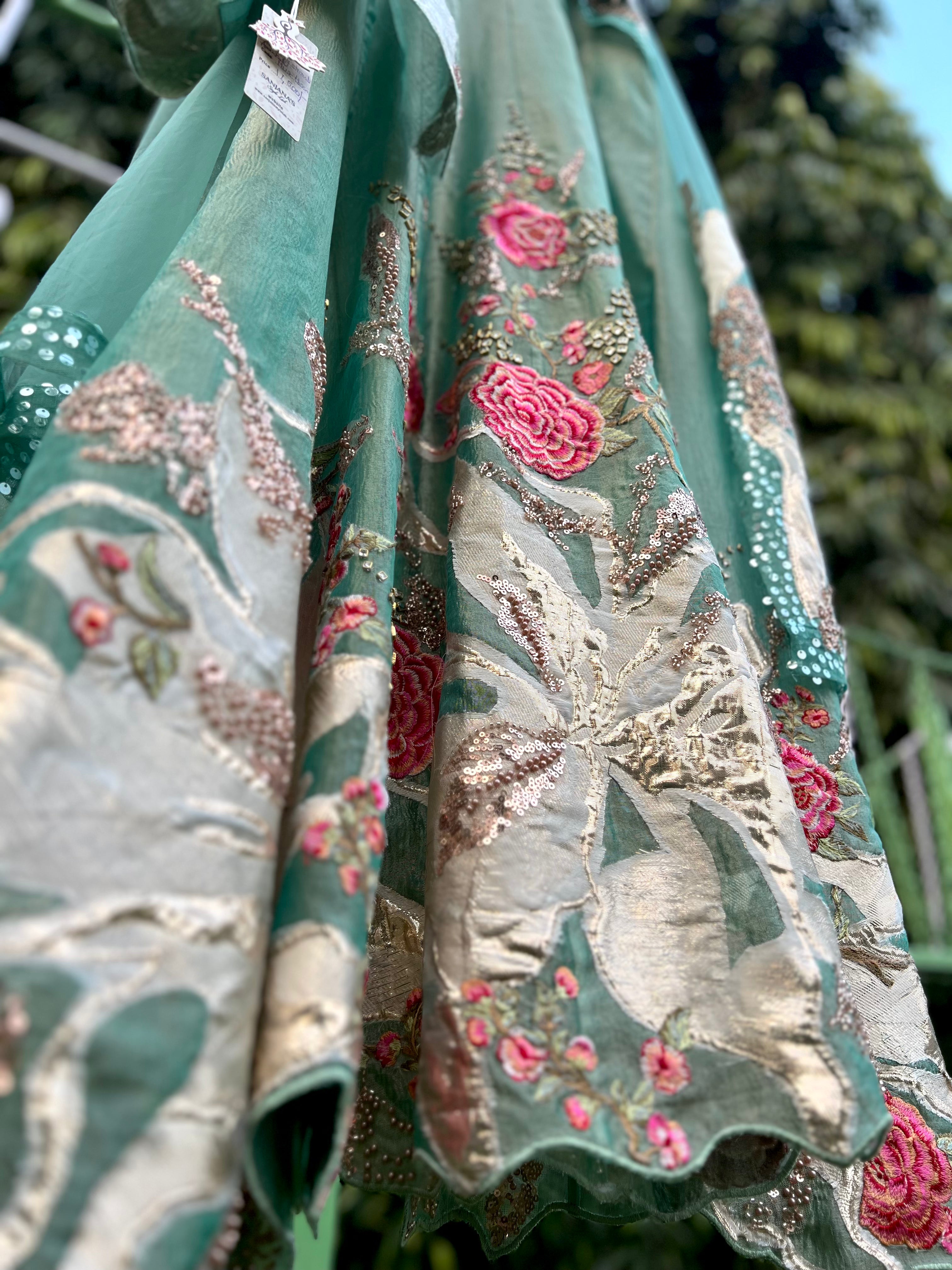 Embroidery- front, back and sleeve -thread work, bead work, sequin, brocade Patch work, kundan and cutdana work. Dupatta- border 4 side sequin border and 1 length embroidery.