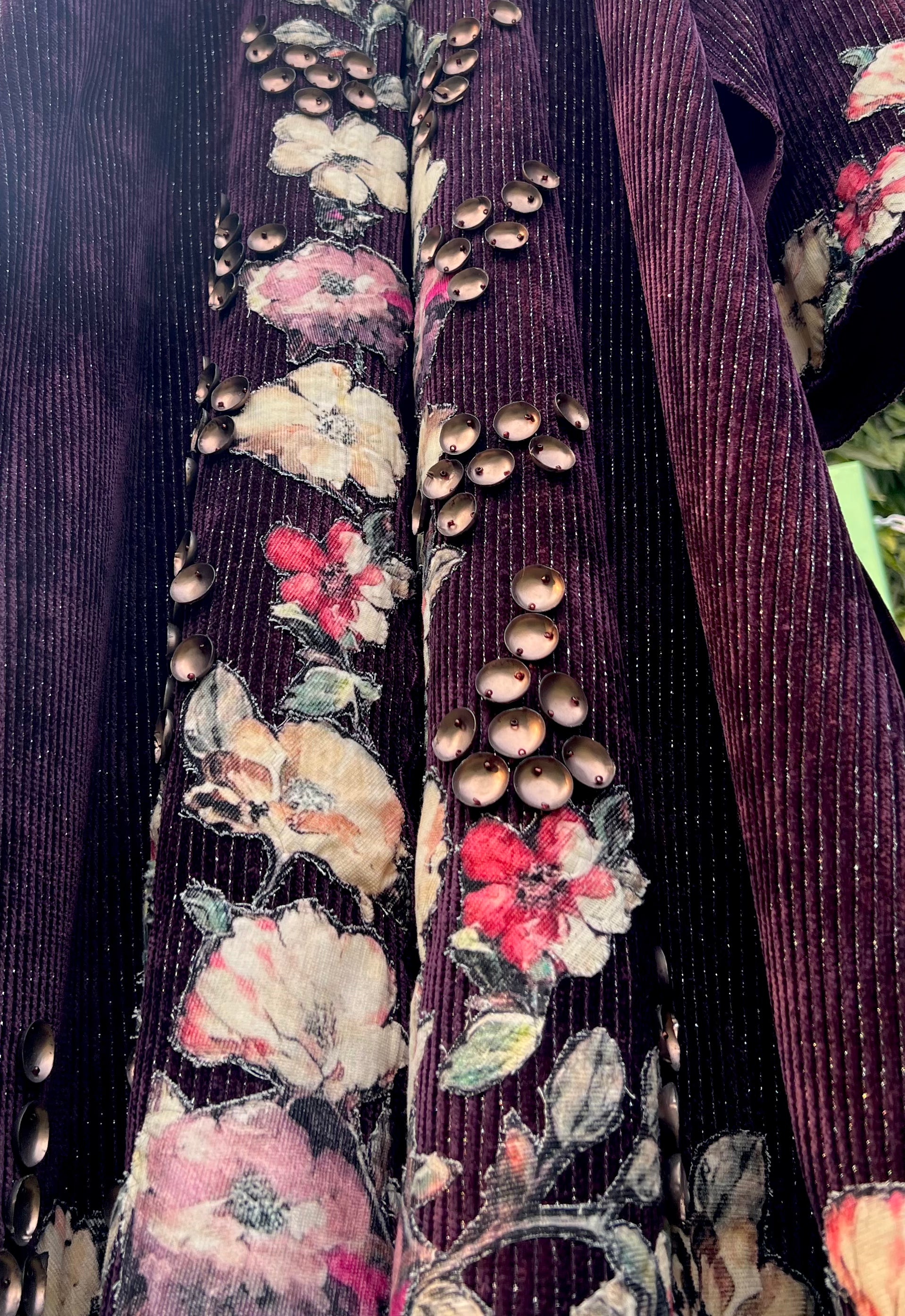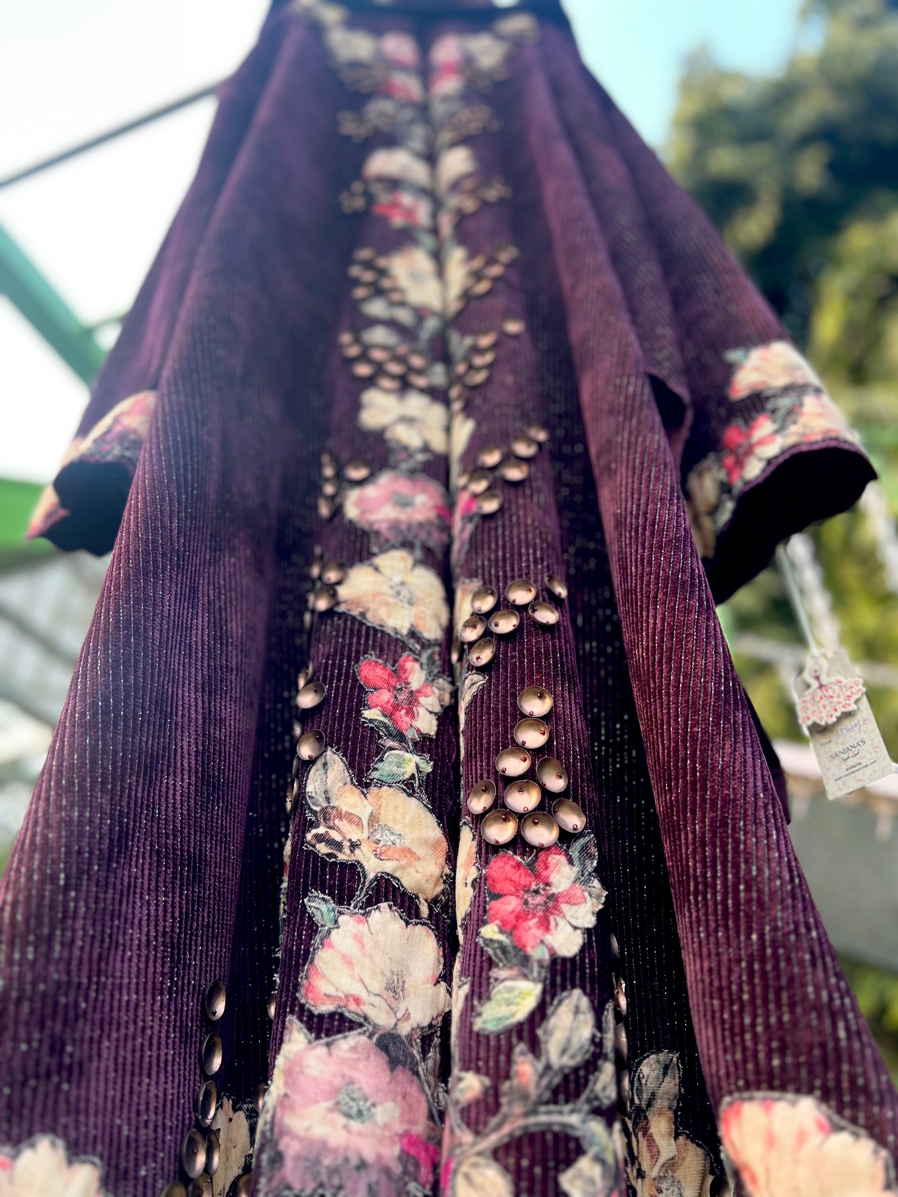 Shirt- front, back and sleeve have tprinted patch work and katori sequin embroidery. Dupatta- 4 side cord velvet border and 1 length embroidery